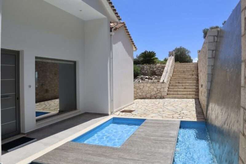 Outside we have two terraces, one on the South side of the villa is a large sunbathing area with a private pool (45 m2) and plenty of sun loungers overlooking the sea. On the other side of the villa is a 120 square meter terrace, with outside kitchen, barbecue and lounge area. Here you can enjoy the view and the nature in all peace. From the house there are steps leading to the sea where there is a platform for sunbathing, swimming or fishing exclusive for guests of Villa Lefkas